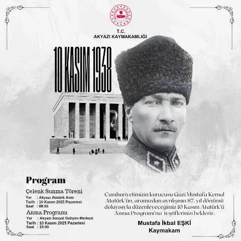 Akyazı Kaymakamlığı 10 Kasım Pazartesi günü uygulanacak programı basına ve ilgili yerlere iletti.