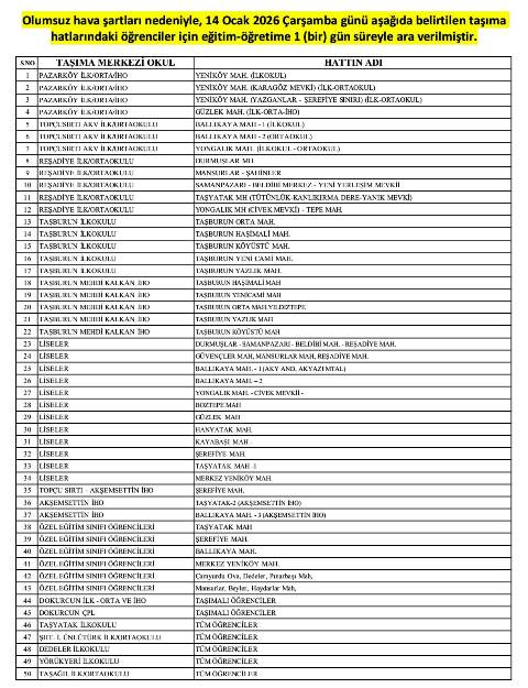 Listede belirtilen taşımalı okullarda eğitim- öğretime 1 (bir) gün süreyle ara verilmiştir.