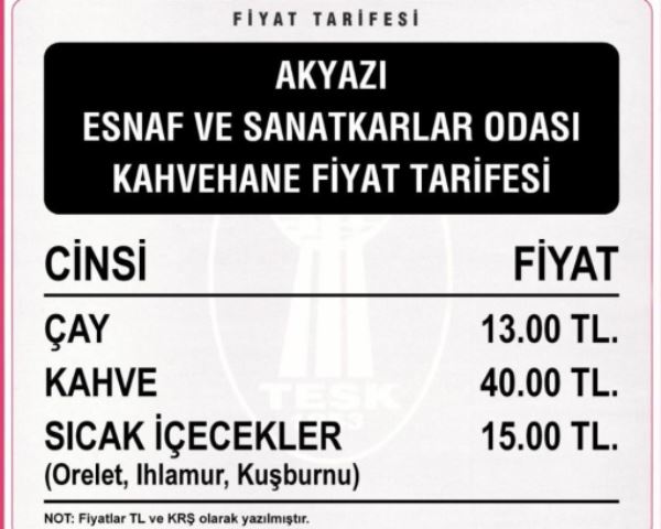 Akyazı Esnaf Odası başkanı Emin Üstün çay, kahve ve sıcak içecek fiyatlarının yüzde 30 oranında zamlandığını açıkladı ve zamlı fiyatlara dünden itibaren başlandığını duyurdu.