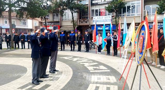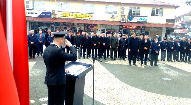 Akyazı’daki ilk tören Atatürk anıtı önünde yapıldı. Buradaki törende Kaymakam Mustafa İkbal Eşki, Belediye Başkanı Bilal Soykan ve Gaziler Derneği yetkilileri anıta çelenk koyarak saygı duruşunda bulundular. İstiklal Marşı’nın söylenmesinin ardından İlçe Jandarma komutanlığından bir teğmen günün anlamını belirten konuşmasını yaptı.