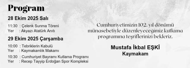 Akyazı Kaymakamlığınca açıklanan programa göre ilk tören 28 Ekim Salı günü saat 11.30 da Atatürk Anıtına protokol tarafından çelenk bırakılarak saygı duruşu ve İstiklal Marşı okunacak.