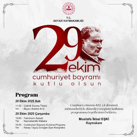 Cumhuriyet’imizin kuruluşunun 102. Yıldönümü tüm yurtta, yurt dışı temsilciliklerimizde olduğu Akyazı’da da çeşitli tören ve etkinliklerle kutlanacak.