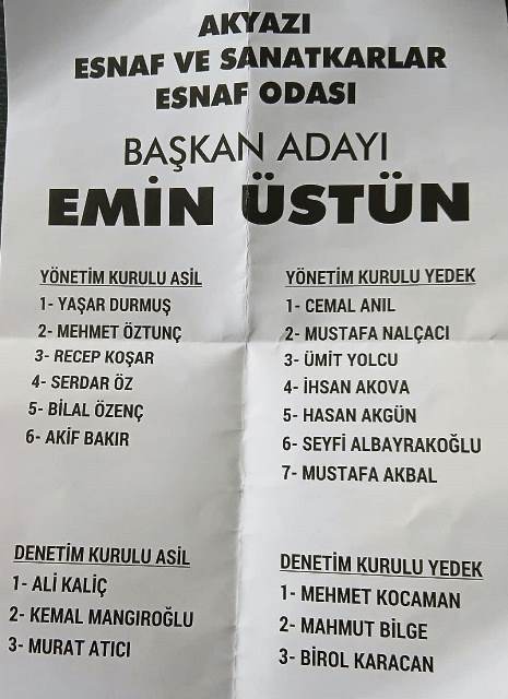 Akyazı Esnaf ve Sanatkarlar Esnaf Odası kongresini yaptı. Düzcanlar düğün salonunda gerçekleşen genel kurul SESOB Genel Sekreteri Cengiz Akalın tarafından yönetildi. Akyazı Oda başkanları Sezgin Durmuş, İsmet Öztürk, Hasan Cengiz ve Hüseyin Kaliç divanda yer alarak Akalın’a yardım ettiler.