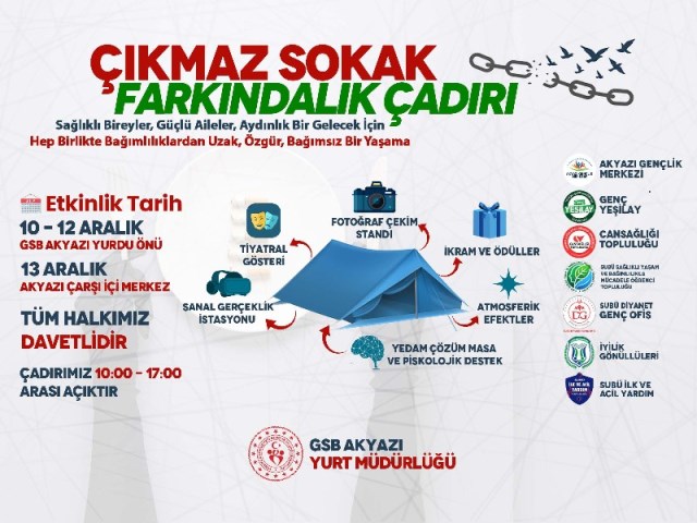 GSB Yurt Müdürlüğü tarafından “Çıkmaz Sokak Farkındalık Çadırı etkinliği düzenledi. 10-13 Aralık tarihleri arasında düzenlenecek olan etkinlik ilk 2 gün yurt Müdürlüğü bahçesinde kurulan çadırda çeşitli etkinliklerle devam edecek 13 Aralık Cumartesi günü Çarşı içinde yapılacak etkinlikle devam edecek ve sonlanacak.