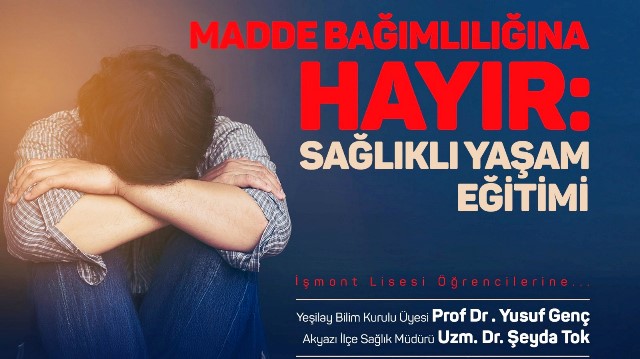 Akyazı Sosyal Gelişim Merkezinde Akyazı İlçe Milli Eğitim Müdürlüğü ve İlçe Sağlık Müdürlüğü ortaklaşa düzenlenen Madde Bağımlılığına Hayır Sağlık Yaşam Eğitimine; Akyazı Belediye Başkan Vekili Mehmet Öztürk, Akyazı İlçe Millî Eğitim Müdürü Hasan Can, Akyazı İlçe Sağlık Müdürü Dr. Şeyda Tok,Sakarya Üniversitesi Sosyal Hizmet Bölüm Başkanı ve Yeşilay Bilim Kurulu Üyesi Prof. Dr. Yusuf Genç, İSMONT Halil Bildirici MTAL Okulu idarecileri ile öğrenciler katıldı.