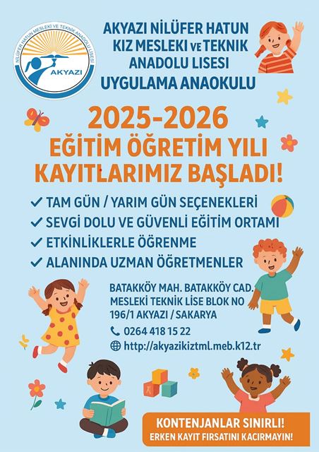 Akyazı İlçe Milli Eğitim Müdürü Hasan Can, Nilüfer Hatun Kız Meslek ve Teknik Anadolu Lisesinin bünyesinde kurulu bulunan “Uygulama Anaokulu” nun 2025-2026 eğitim öğretim yılı için kayıtların alınmaya başladığını açıkladı.