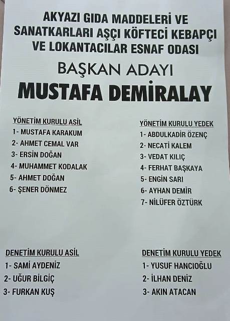 Akyazı Gıda Maddeleri ve Sanatkarları Aşçı-Köfteci-Kebapçı v e Lokantacılar Esnaf Odasının Genel Kurulu yapıldı. Mustafa Demiralay rakipsiz bir şekilde seçime gitti ve 5.kez Odanın başkanı seçildi.