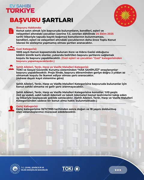 Çevre, Şehircilik ve İklim Değişikliği Bakanlığına bağlı TOKİ tarafından İlçemize yapılacak olan 500 konutluk yeni projenin hayata geçirileceğini söyleyen Ak Parti İlçe Başkanı Mesut Ekrem, Batakköy Mahallesi sınırları içinde yapılması planlanan bu projenin Akyazı’nın gelişimi ve konut sahibi olmak isteyen Akyazılı vatandaşlar için büyük önem taşıdığını belirterek konut sahibi olmak isteyenlerin 10 Kasım 19 Aralık 2025 tarihleri arasında müracaat etmeleri ve müracaat bedeli olarak da 5 bin lira yatırmaları gerektiğini, kuraların 29 Aralık 2025 ila 27 Şubat 2026 çekileceğini, teslimatın ise Mart 2027 tarihinde yapılacağını, ödeme planının ise %10 nun peşinat olarak alınacağını, 240 ay vadeli olacağını ve taksitlerinde 6 bin 750 TL. olarak ödeneceğini söyledi ve TOKİ ile Sosyal Güvenlik Kurumu sisteminden “HAK SAHİPLİĞİ” onaylanan Akyazılıların müracaat etmelerini istedi ve başta Cumhurbaşkanı Erdoğan olmak üzere ilgili Bakanlığa ve TOKİ yetkililerine bu proje için teşekkür etti.