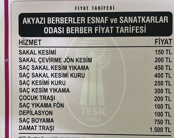 Akyazı Berberleri bir kez daha zam almayı başardılar. Yaptıkları müracaatları olumlu bulunan ve Sakarya Esnaf Odaları Birliğinden yüzde 30 zam almayı başaran berberler, yeni tarifeyi hemen devreye soktular ve tıraş olan vatandaşlardan yeni zamla ücret almaya başladılar.