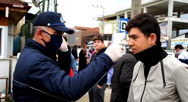 3-Pazarcı esnafının ve pazaryerine giren vatandaşlarımızı temassız ateş ölçer ile kontrol ediyoruz.